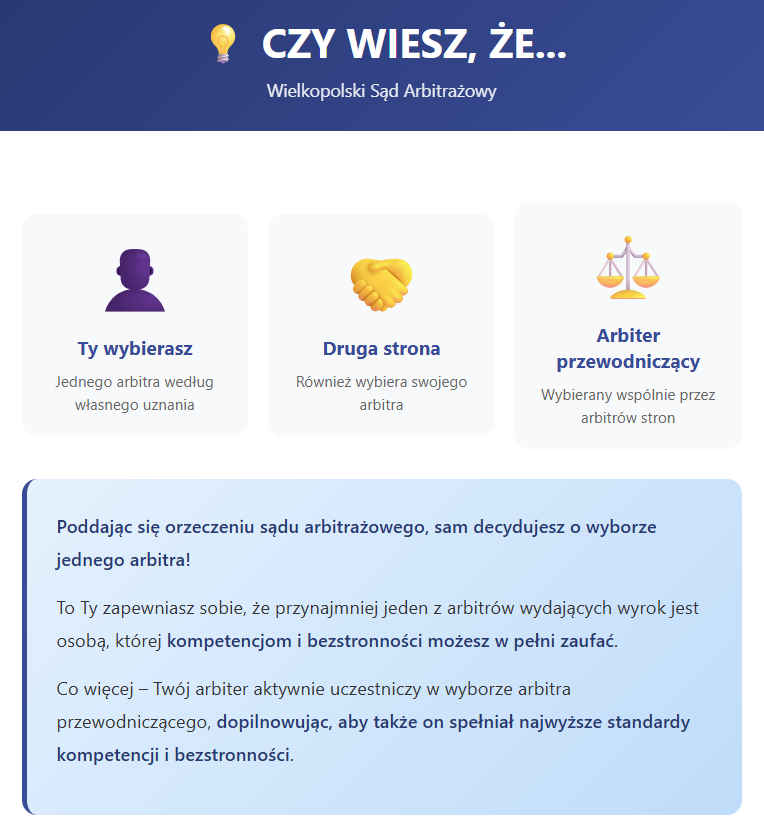 💡 CZY WIESZ, ŻE… Poddając się orzeczeniu sądu arbitrażowego, sam decydujesz o wyborze jednego arbitra!